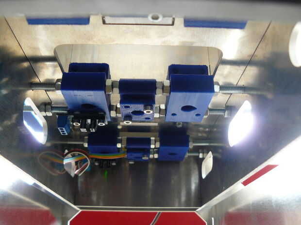 Con el pistón y esparcidor hecho el marco sí mismo puede ser montado. Todas las conexiones en el marco se realizan mediante conexiones T-slot. Empuje una tuerca M3 en esta ranura y use un tornillo de M3 para conectar 2 piezas del marco. Antes de apretar todo, compruebe si el abeto pistones suavemente hacia abajo de la tolva. Si no, ajuste las paredes de la impresora hasta que lo hacen.
