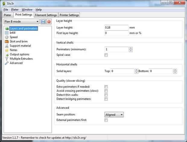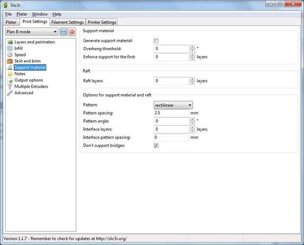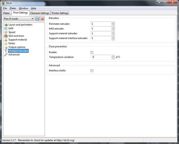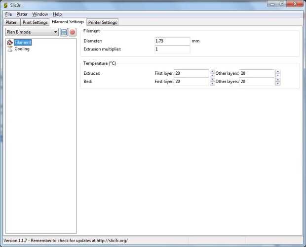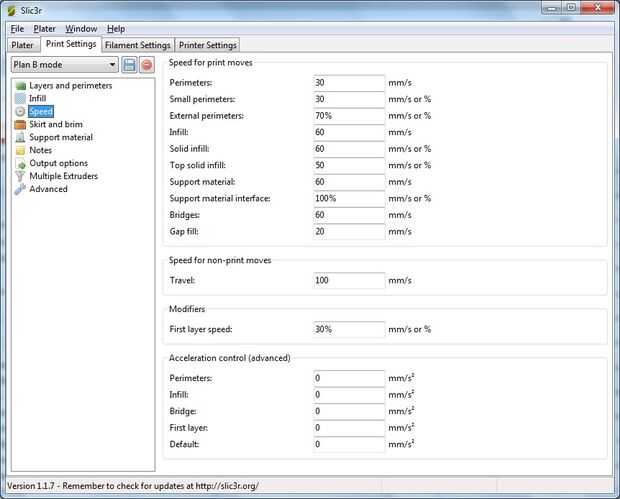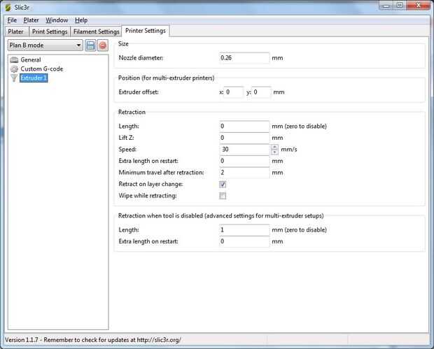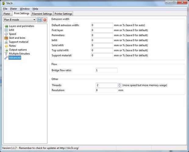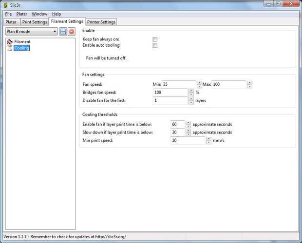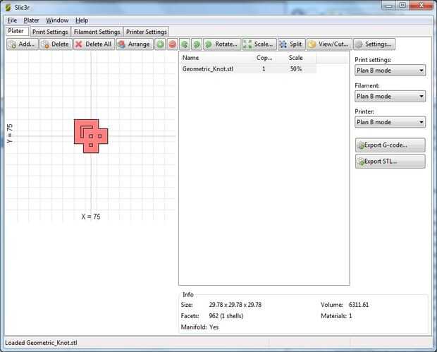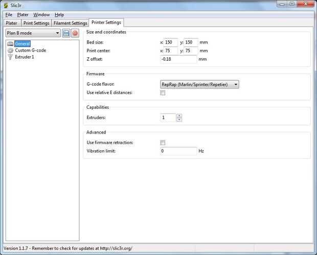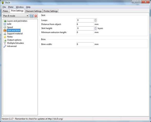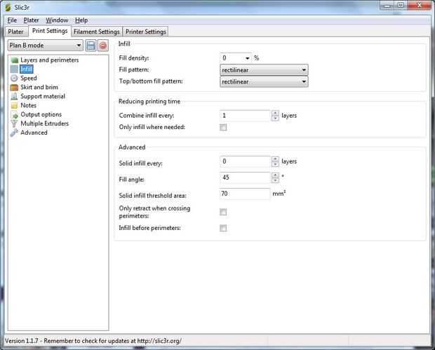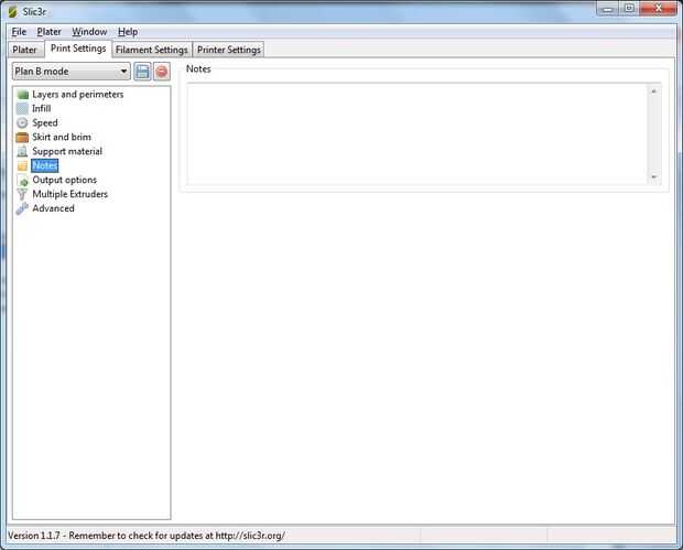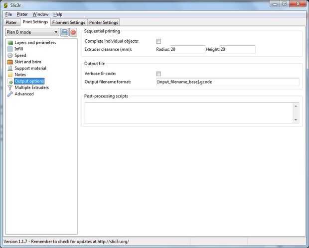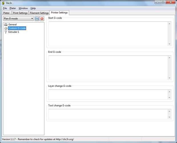 Plan B puede imprimir utilizando Gcode ordinario, pero imprime órdenes de magnitud más rápidas con su propio código especial. Este está optimizado para la impresión con un cartucho de 12 boquillas. Para hacer este código, un archivo STL tiene que ir a través de 2 programas diferentes. Primero debe pasar por Slic3r para convertir a Gcode configurado especialmente. A continuación, se convierte por el convertidor de Plan B a código específico especial de Plan B. Esta forma de hacer un archivo puede ser un poco engorroso, pero ahora mismo es la única manera de hacer confiablemente que el código de Plan B. Están mejoras para optimizar el proceso de fabricación de una máquina cortadora especial que puede convertir al instante archivos STL.