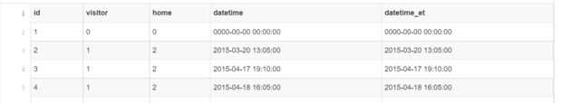 El primer paso para esta herramienta implica la toma de datos. Preparación todo está en la carpeta data_prep /. Para la aplicación de este béisbol, tuve suerte de encontrar datos sobre el valor de separados por comas (CSV) 2015 en reddit aquí. Utilizar python para iterar sobre todos los 30 equipos en el archivo CSV, biblioteca de python geocodificadores Parque de búsqueda del nombre a coordenadas de latitud y longitud, y finalmente imprimir extractos formateadas formato de sqlite3. Sqlite3 insertar declaraciones también se crean para cada juego programado. Por último, estas instrucciones se ejecutan para crear una base de datos sqlite3 con dos tablas - equipos y programas.