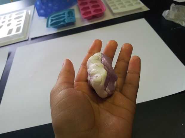 3. Seguir mezclando las dos partes rápidamente hasta obtener un color lavanda. Asegúrese de que usted no trabaje más el molde, como establece rápidamente