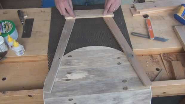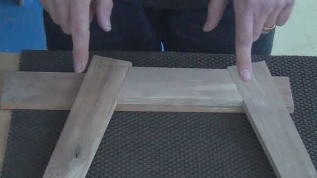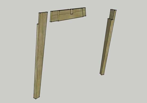 La longitud de las láminas de riel determine el ángulo que las piernas splay en. Esto depende de usted, pero deje suficiente espacio entre las piernas para garantizar cómodamente la parte superior con tornillos a través de los rieles. Los ángulos que se deben cortar los extremos del travesaño en están tomados directamente de las piernas, como se puede ver en la foto. Una laminación de carril se extiende hacia el exterior de las piernas, el otro sólo en el interior de las piernas - formando una mitad de media vuelta de empalme en cada extremo. Entonces estos se pegan para hacer los dos rieles.