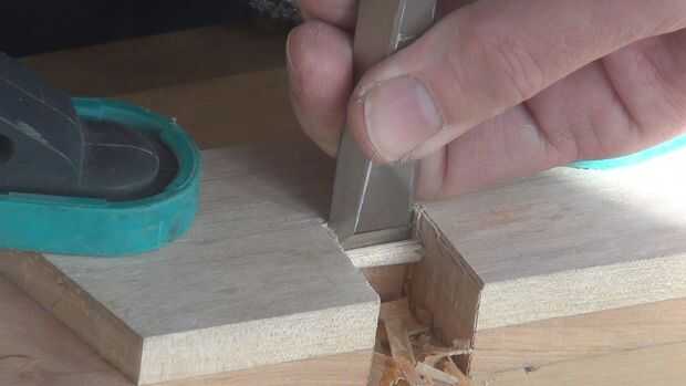Se corta una muesca en cada riel, una en la parte superior y otra en la parte inferior, formando una Cruz conjunta reducir. El ancho de cada ranura debe ser igual al espesor del otro carril, y ambos deben estar centrados en los rieles.