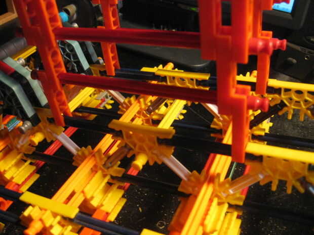 Se trata de una máquina de la fruta de trabajo que se hace casi en su totalidad de K'Nex. Es tan grande que tendrá que permanecer en el cuarto (que tiene un piso de concreto) para siempre.La máquina paga en bolas, el tamaño de la victoria siendo la c