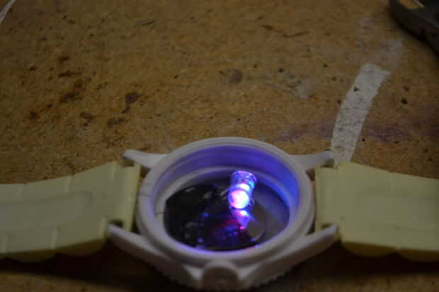 Poner el Led en el reloj y pato cinta adhesiva a la batería y ponga la parte posterior del reloj nuevo.