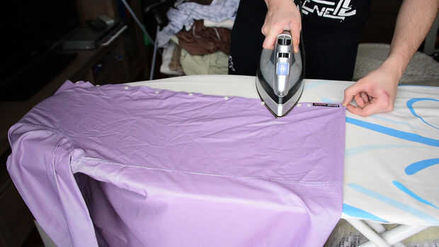 Esto es probablemente la parte más fácil de planchar una camisa. Coloque la camisa hacia fuera en la tabla como se muestra. Todo lo que realmente tienes que hacer es todo en el tablero, excepto el borde con botones de hierro, allí tienes que ir con cuidado alrededor de cada uno de ellos.
