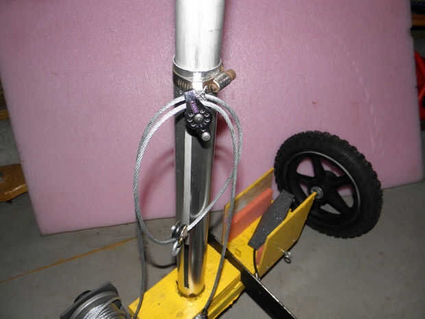 Después de averiguar qué longitudes para hacer los tubos para conseguir la correcta extensión un poco más allá de lo que crees que serán necesario entonces puede cortar los tubos. Inserte el tubo más grande en el orificio del tubo en el marco y marca donde se encuentra con la madera. Retire el tubo, colocarlo en una abrazadera o mordaza robusta y trace una línea de 1" por encima de la marca a 2" debajo de la parte superior del tubo. Ahora necesita cortar una ranura limpia en el tubo sólo un poco más ancho que 1/4". Lo hice utilizando un router en una pista bien sujeta y moviendo muy lentamente. Otras posibles formas de cortar la ranura pueden ser utilizar una sierra de dado, una herramienta Dremel, Sierra de mano y archivo, etc.. En cualquier caso, dibuje una línea sobre el tubo con un marcador y proceder muy lentamente por lo que la ranura es liso y recto. Alrededor de los extremos de la ranura con una lima redonda para eliminar el estrés en las esquinas. Ahora usted puede poner algunos epoxy en el tubo e insértelo en los trozos de madera hasta fondos en la placa de aluminio y déjelo curar. Asegúrese de la ranura hacia el lado donde estará el tambor del cable del cabrestante se enfrentan. (Ver fotos).