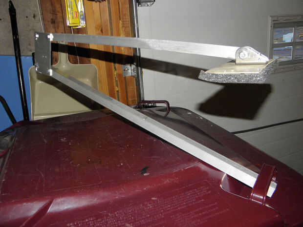 Construir el soporte del ala como se muestra en la foto de arriba una placa se emperna a los dos tubos rectangulares y haciendo orificios ranurados en la placa para el ajuste inicial. Utilicé cuatro pernos de 1/4-20. Mi ala tiene un acorde centro de 39" por lo que mi tubo más largo es 26" y el pedazo corto 22". El ala puede requerir dimensiones ligeramente diferentes pero esto no es una pieza fundamental como sostiene el ala firmemente. El cojín al final es aluminm montado sobre un soporte pivotante en forma de C con un perno de 1/4-20. Pegue una almohadilla de espuma densa 1/2" sobre la almohadilla, que se extiende más allá de los bordes para proteger el ala.