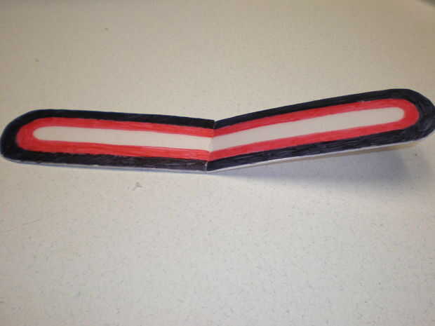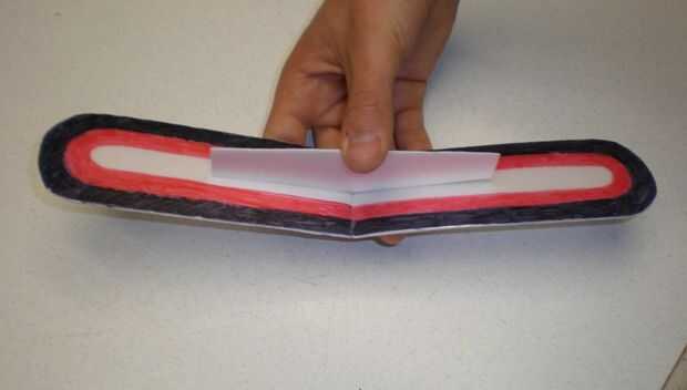 1. para hacer el ala, poner una gota del pegamento en el borde del 1 ala de la mitad, como se muestra y presione los dos juntos. Antes de que el pegamento se seca, sostenga el calibrador diedro en su lugar el el punto de está en medio de las 2 piezas y reténgalo ahí hasta que el pegamento se seque. Quite el calibrador de diedro; usted no necesita otra vez. También puede ir sobre la articulación con otra gota de pegamento en la parte superior para reforzarla (cuadro 7).