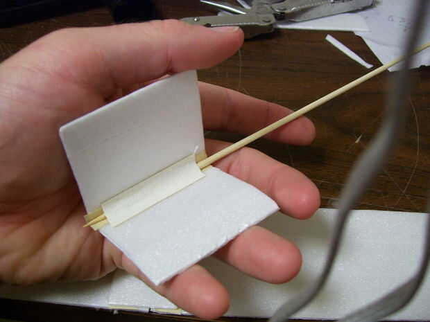 El cuerpo consiste en una división de pincho de bambú por la mitad y un trozo de espuma se dobla en un ángulo con las alas. conectar el pincho a la pieza de espuma.