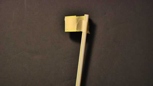 El pequeño aro a un extremo de la paja con un lado abierto paralelo con la apertura de la paja de la cinta. Cinta el aro grande en el extremo opuesto de la paja pero alineado con el aro pequeño. Más centrado en los dos son, mejor.