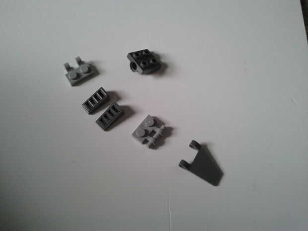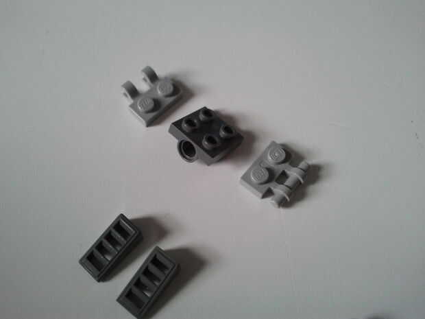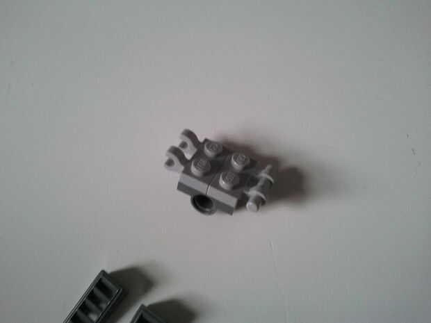 1. Coloque la placa de 1 x 2 con los clips en el lado izquierdo de la placa de 2 x 2 con 1 agujero técnica (con el agujero hacia usted) y la placa de 1 x 2 con manija en el lado derecho.