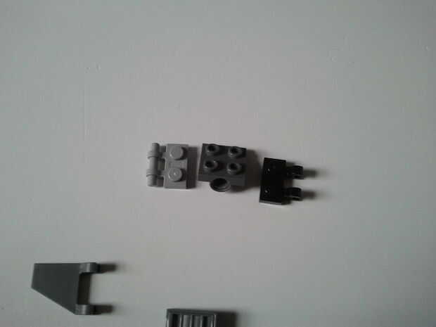 1. Coloque la placa de 1 x 2 con clips a la derecha de la placa de 2 x 2 con 1 agujero técnica (con el agujero hacia usted) y la placa de 1 x 2 con manija a la izquierda.