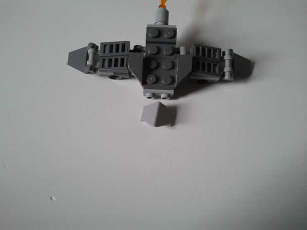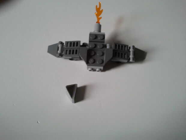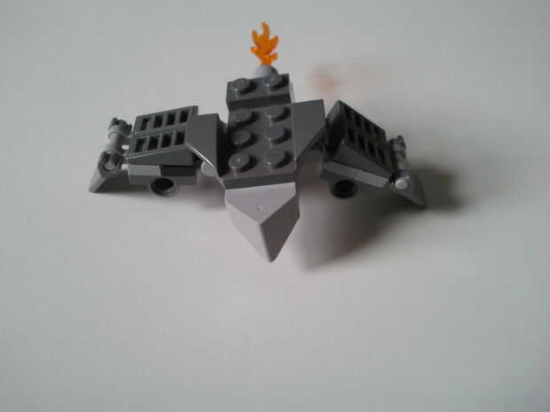 Ahora finalmente tenemos que añadir la pieza de 1 x 2 ático y hemos terminado. Fije la pieza de 1 x 2 ático en los postes frontales (frente a la pieza de la llama) con la punta hacia abajo como en la imagen y listo.