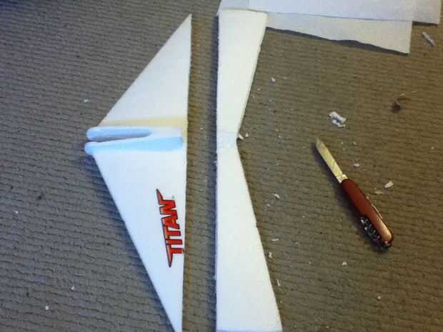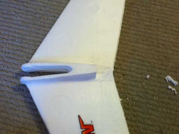 Extraiga el estabilizador horizontal del fuselaje del avión. Toma su cuchillo y corte la espalda pulgadas y media (1,5 pulgadas) de la viga de centro. Afeitado abajo los restos para que esté al mismo nivel con el resto del ala. A continuación, utilice cualquier borde estrecho disponible (por ejemplo una regla, Plaza, etc.). Con su cuchillo, marque una línea recta a lo largo del estabilizador horizontal, asegurándose de que está en la base de la viga de centro. Corte a través de todo el camino después de haber comprobado que precisión. El estabilizador horizontal debe estar ahora en dos piezas. La mitad posterior formará el ascensor.