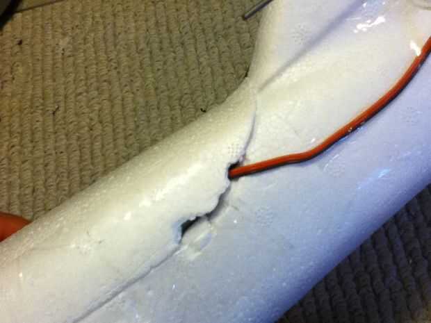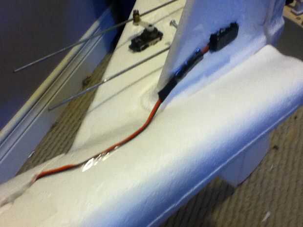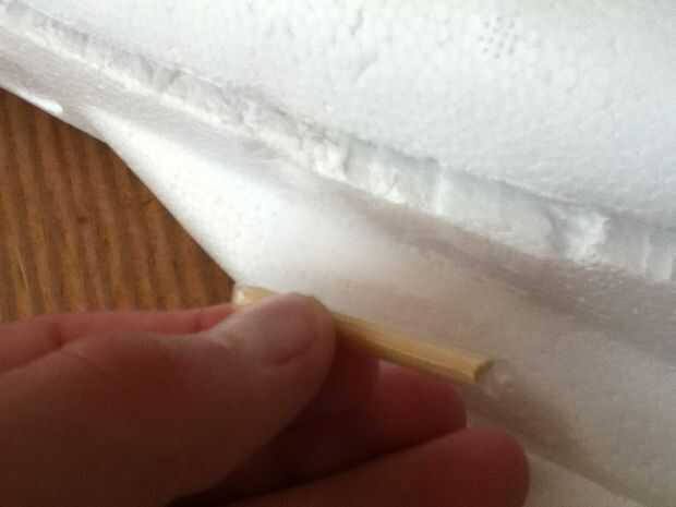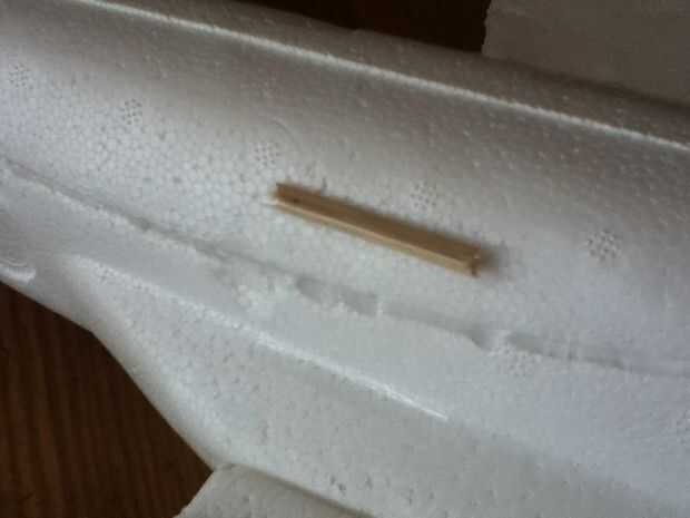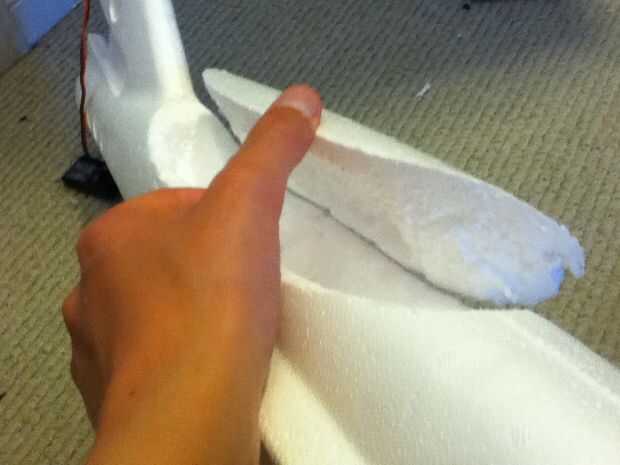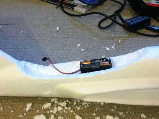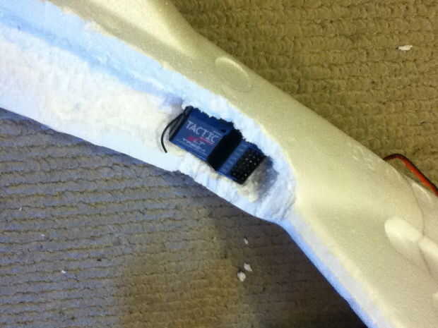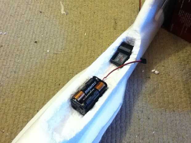 Utilice un cuchillo o los dedos para cavar hacia fuera un compartimiento lo suficientemente grande como para caber la batería, así como el receptor. Cuando se trata de montar la batería, usted puede hacer un retirado sólo un poco más pequeño que el paquete de baterías, por lo que se ajusta perfectamente y no se moverá durante el lanzamiento. Ahora usted puede asegurar el receptor y la batería con una tira de cinta. Para asegurar la cubierta superior del fuselaje se puede utilizar la pieza existente que ha cortadas y hueco, entonces utilice cinta para crear una bisagra simple, así como para garantizar en el otro lado. He utilizado una pieza extra de pincho para crear un tire de la pestaña en la cinta para ayudar a abrir el fuselaje. Ahora puede ejecutar los cables de los servos en el fuselaje y en el receptor.