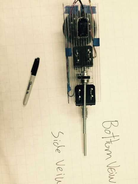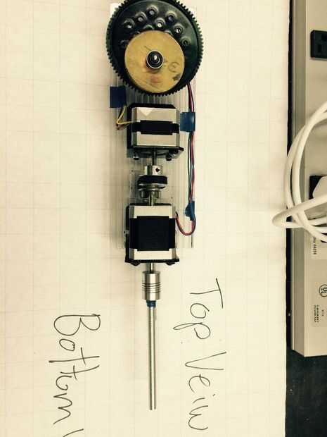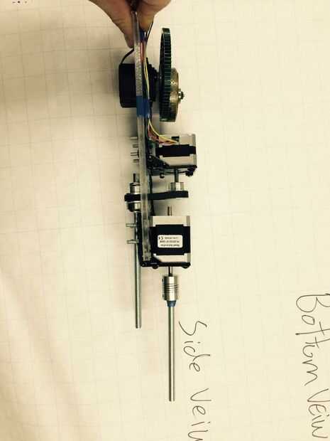 Trabajando nuestro camino hacia el centro de la vela, el siguiente fue el montaje del paso a paso y servomotores. Uso de láminas de cartón plástico, hemos creado a una especie de estante para caber dentro del tubo. Montamos los dos motores paso a paso al plástico utilizando soportes pre-hechos. Debido a espacio limitado en el tubo, hemos fabricado un sistema de polea para el motor de pasos más pequeños para que los motores podían sentarse en la misma alineación, sin embargo, gire a la varilla roscada en diversas alineaciones (para que coincida con la configuración de las jeringuillas en el Monte). Este cambio de alineación se aprecia en el cuadro de la vista lateral. Para acoplar el motor servo para el cartón plástico, simplemente corte un agujero del tamaño del motor y había pegado a él en. La posición del peso en el servo fue ubicado estratégicamente en el centro de la vela para maximizar el control de estabilidad. Todos los cables de los tres motores fueron dirigidos hacia la parte posterior de la vela.