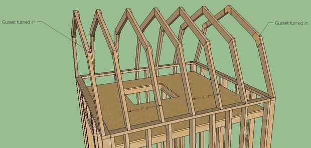 Las vigas del techo son conectados a las placas de pared en 16 centros con clavos y toenailed en su lugar. Aviso: los refuerzos se dan vuelta hacia adentro en las vigas del techo sobre los extremos de la pared por lo que hacen no interferir con el forro exterior. Puede utilizar un tablero de soporte provisorio para estabilizar las vigas del techo hasta que se instale el revestimiento del techo.