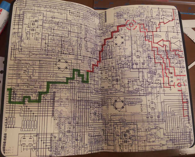 -Sharpies en verde, azul y rojo/naranja. Porque el papel no es blanco, colores de neón funcionan mejor.