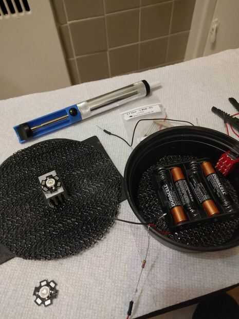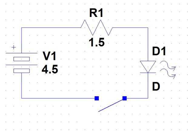 Nota: los valores pueden diferir de esta imagen, la tensión (V1) que utilicé fue de 6 V y la resistencia (R1) fue 3,9 ohmios. Por favor consulte la sección 'Cálculos de resistencia' en el paso 1 sobre cómo encontrar el valor de resistencia. Para el voltaje, cada pila AAA 1,5 V, utiliza cuatro baterías AAA tener 6 V.