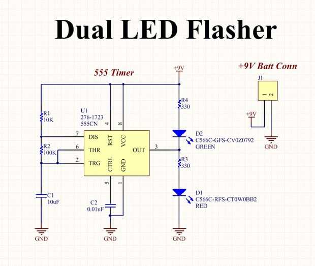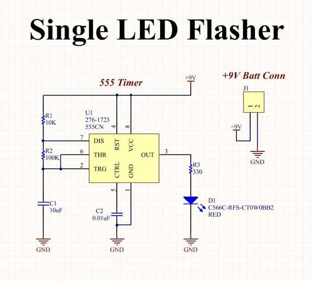 Hay varias maneras de hacer que un LED flash y otra pero una de las maneras más simples y confiables utiliza un temporizador 555 configurado en modo astable. Estas son muy comunes interconexiones usadas para una variedad de propósitos y mantienen un ritmo constante, por lo que es perfecto para utilizar aquí. Caminando por el esquema, se utilizan los siguientes componentes: