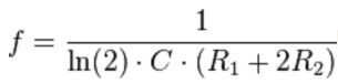 - C1 se carga a través de R1 y R2 pero sólo descarga a través de R2. Tenemos que asegurarnos de que R1 y R2 son una impedancia lo suficientemente alta para que la salida se mantiene cerca de cero durante la descarga. Elegir R1 10k e ir de allí. La ecuación para la frecuencia en modo astable se muestra así.