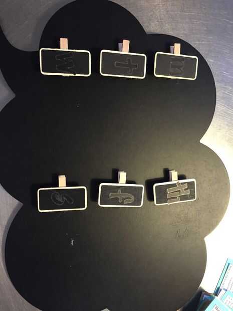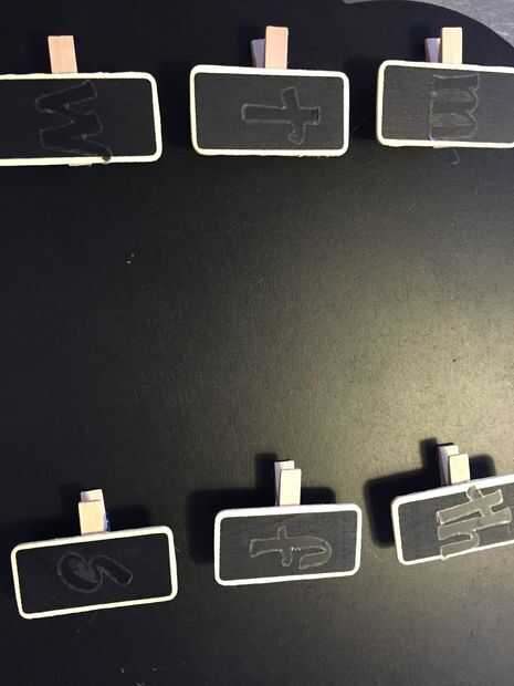 No hay necesidad de obtener lujo - funcionará alguna pinza o broche. Tomó 6 pinzas para la ropa y mi pistola de pegamento caliente y adhesed en el frente de la pizarra magnética. ¿Por qué 6 y no 7 o 14? Yo realmente sólo necesitaba esto para la hora de la cena como almuerzo en las escuelas. Siempre tenemos sobras y salimos a comer de una vez por semana. Entre esas cosas tener 6 ideas para el menú listo cada semana es suficiente.