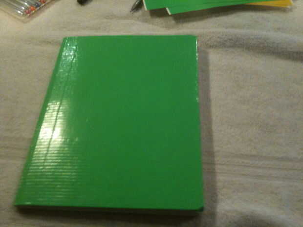 Teniendo una regla, uniformemente empuje el resto de la hoja de cinta del conducto sobre la cubierta, mientras pelar el forro. Doblar los bordes sobre la cubierta y alrededor de la Unión. En la parte superior e inferior de la Unión, recortar la hoja donde no tiene espacio para doblar. No te preocupes si las esquinas están sucias. Doblarlas cuidadosamente como sea posible. Serán acabados apagado en el paso siguiente.