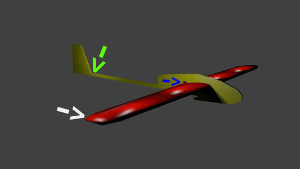 Realice 2 alas simétricas que el tamaño no importa solo Asegúrese de que el ancho del plano es igual a la longitud. Ahora montar las alas en el avión con un pequeño tornillo (flecha azul). Asegúrese de que el ala puede mover todavía. Ahora pega un pequeño trozo de alambre en un bucle en la parte superior de las alas (flecha blanca). ahora hacer lo mismo en el otro lado. Ahora haga un agujero en la parte posterior de la historia para que los lazos pueden caber a través de. la final revendida debería verse como la tercera imagen. No te olvides de hacer un ala de la cola para el plano que sea 1/2 el tamaño del ala solo
