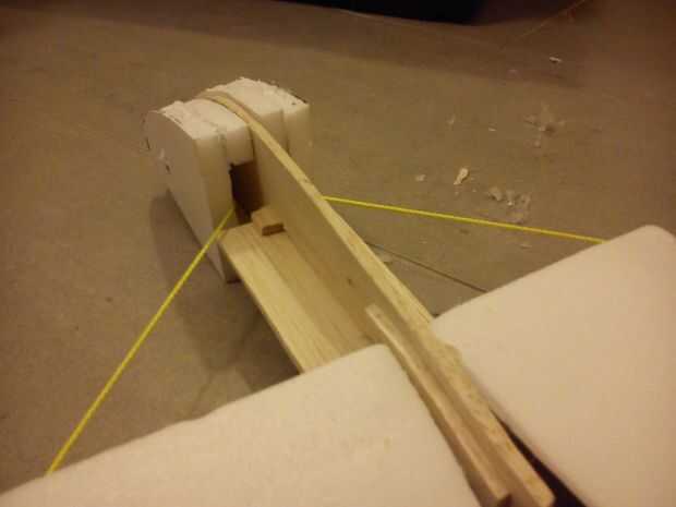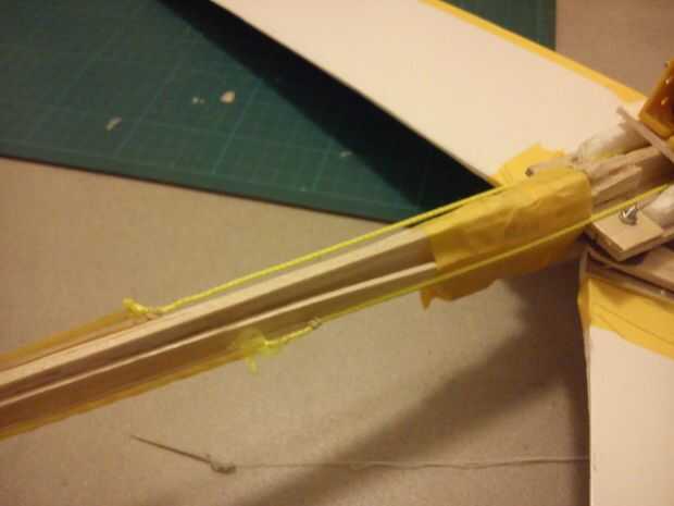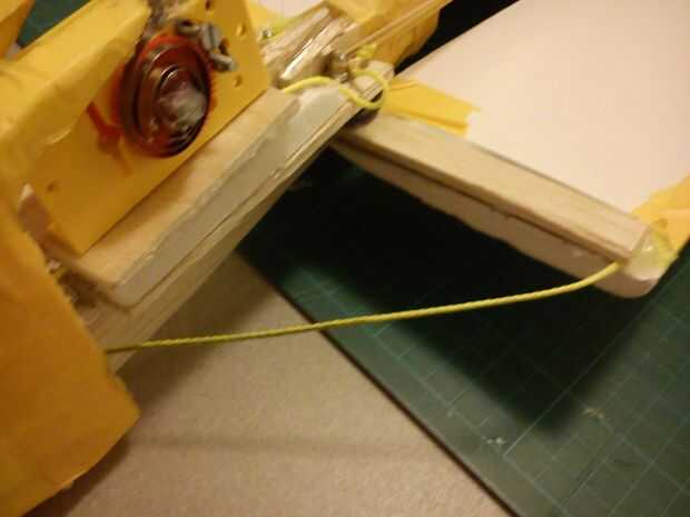 Ahora usted debe hacer un sistema que automáticamente se abra usted las alas. Hacen conectando un cable al ala como se muestra en la imagen 1. Entonces usted debe hacer un sistema que permite el cable para encender (como se muestra en flecha roja) lo hice agregando un perno dentro de la cabeza de espuma. La cabeza se puede hacer de láminas de espuma (imagen 3). Entonces debe conecta el alambre a las bandas de goma (imagen 4) que están conectados a la parte posterior del plano (imagen 5).