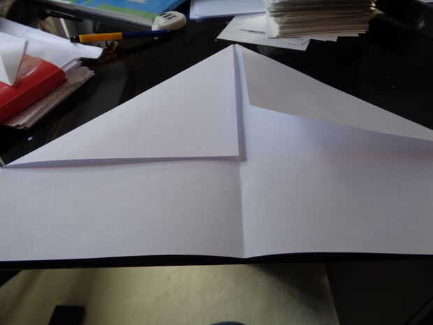 Primero doblar el plano ancho, dobla las dos esquinas y los pliegues. Doblar el plano por la mitad a lo largo el primer doblez que hiciste y luego plegar las alas. El fuselaje debe ser un centímetro de alto. Mientras estás aquí, corte alrededor de 2 pulgadas a lo largo de la línea donde el papel con dos capas se une con la broca con una capa.