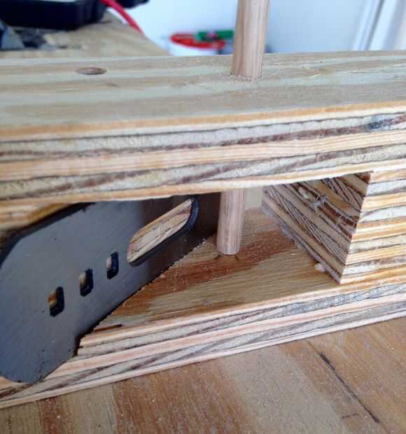 Adiviné en dónde ubicar una barra pasador para asegurar la hoja con una cuña. Después de que había perforado un agujero a mano con un taladro eléctrico, me coloca el pasador y había marcado su ubicación adecuada en el interior de la otra parte del cuerpo. He quitado el pasador y perforar el segundo orificio.