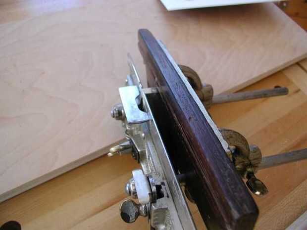 Es la Stanley no. 45 con un cortador de rebajo de 7/8 de pulgada instalado. I afilar la herramienta de corte, aplanado y pulido de la parte posterior y establecer un cartabón primario en 30 grados, afilado con piedra y pulido a grano 4000. Observe la guía es en realidad debajo de la herramienta de corte haciendo rebajos y es a la anchura de la barbilla. El patín deslizante (patín de apoyo en este caso) está en el exterior del cortador o cuchilla, ocultada por el cerco de palo de rosa. El tope de profundidad ajustable es también a simple vista.
