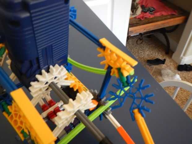 Lugar la cosa en la segunda foto en el avión como se muestra en el cuadro 3. Y para el amarillo pega en un extremo se ajusta a los conectores azules y diapositivas en los orificios como se muestra en la foto 4. Consulte las notas.