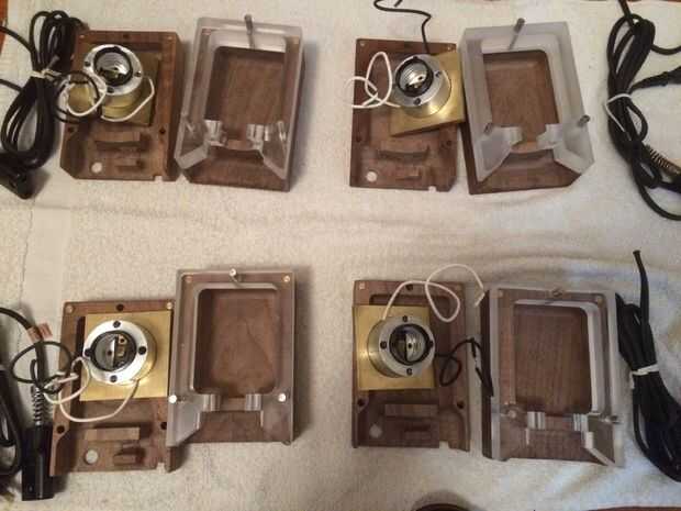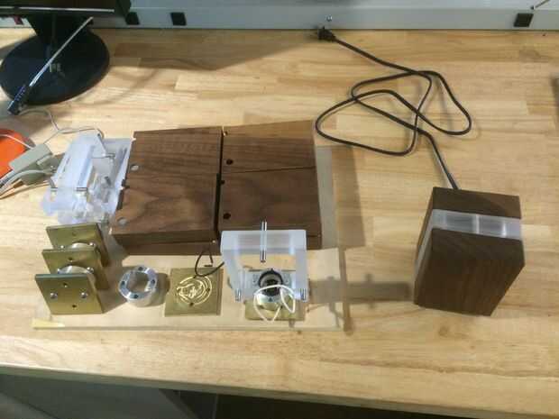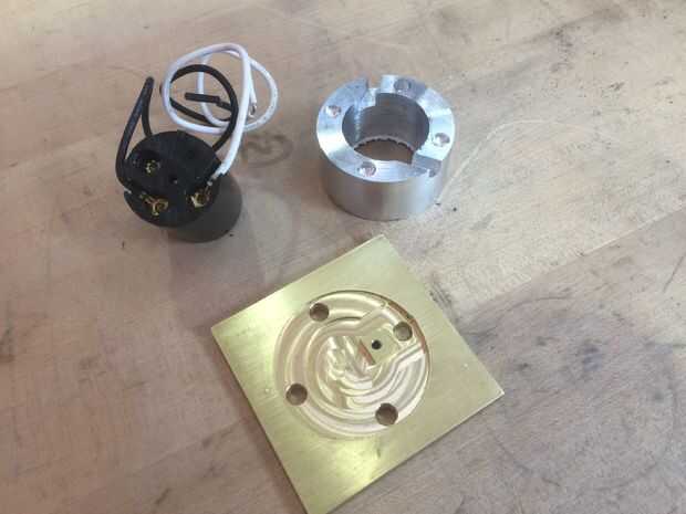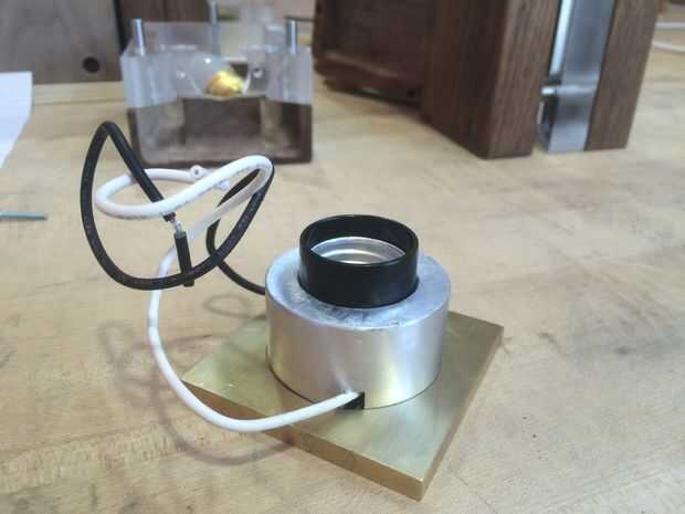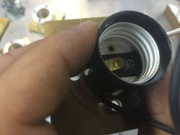 En primer lugar, quería montar una lámpara completa para asegurarse de que todo estaba funcionando bien. Esto comenzó con la base, lámpara y luminaria. Tenga en cuenta la pequeña 6-32 tornillo que sujeta la lámpara a la base. Cable para arriba, y presiona la lámpara junto. Necesitaba utilizar chapa de 1/16" para espaciar las piezas adecuadamente lejos de uno a otro, que es una característica que voy a cambiar en la próxima versión del diseño - lo que es por lo que las partes presione hasta el fondo.