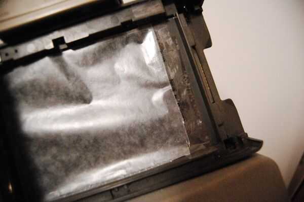 El pedazo de papel de cera hasta el plano de la película (la parte abierta de la caja de antes) a lo largo de los bordes de la cinta. Usted podría asegurarse era plana, pero si inclina un poco obtendrás imágenes torcidas funhouse. Debe ser capaz de ver una imagen débil ahora al abren las persianas (o falta). Si es realmente brillante donde estás en probablemente no ves nada, eso es normal.