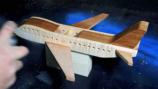 Limpiar pegamento exprimir con un cincel y lijar todas las superficies lisas. Aplicar el acabado elegido. Rociado mi avión con laca de brillo claro para mantener el color natural de la madera.