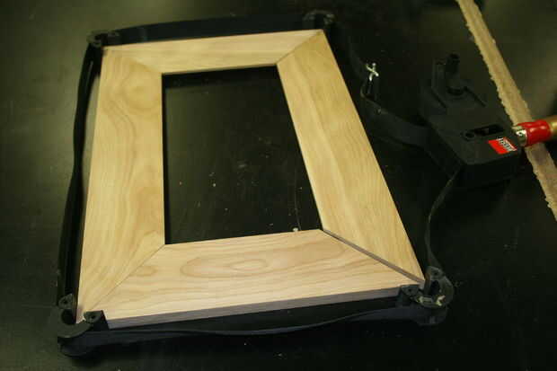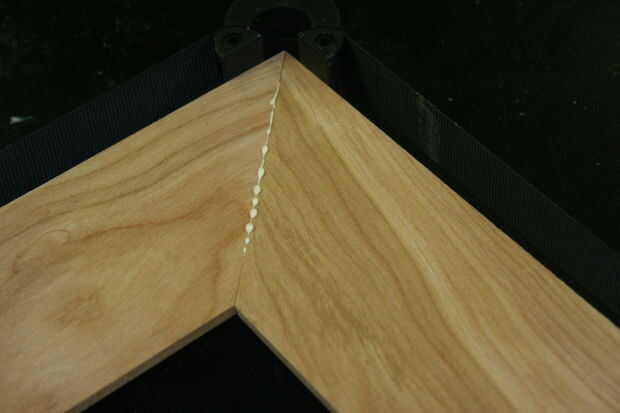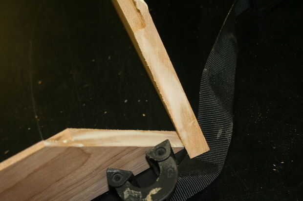 Abrazaderas de correa funcionan mejor para pegar el marco. Utilizar las abrazaderas de correa y ajuste seco el marco una vez más. Esta es la prueba realmente, si no tienes espacios aquí no tendrás en la cola para arriba.