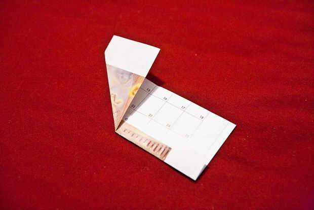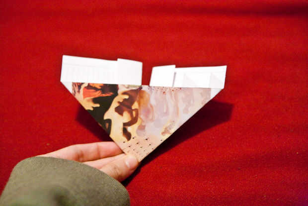 -Doblar la mitad izquierda para que el borde horizontal inferior cumple con el pliegue de centro vertical.