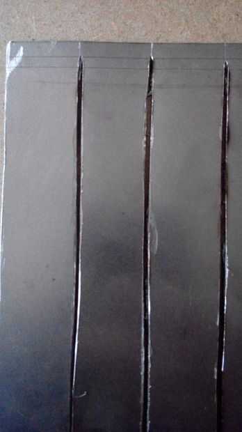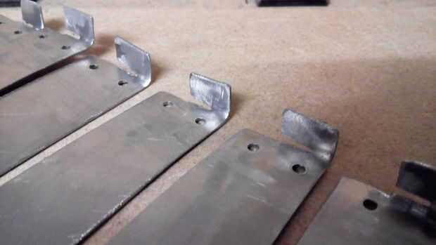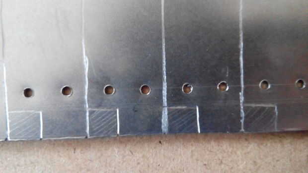 Cortar la hoja de acero de la misma manera como en el dibujo con el pulido rueda o una sierra para metales. Cuando usted corta el 'strip', usted tiene que parar 5mm desde el borde de corte (en el lado con sólo 3 agujeros). Después corte la parte pequeña y doblarlas, también tomar el espesor de la hoja en cuenta cuando usted doblarlas. Luego Taladre los orificios.