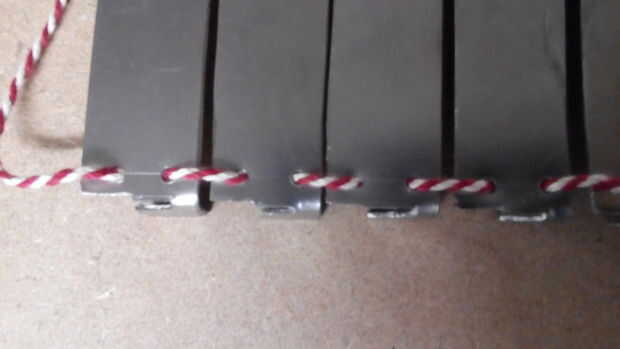 Inserte la cuerda por los agujeros en la imagen que es de la parte doblada hacia abajo.