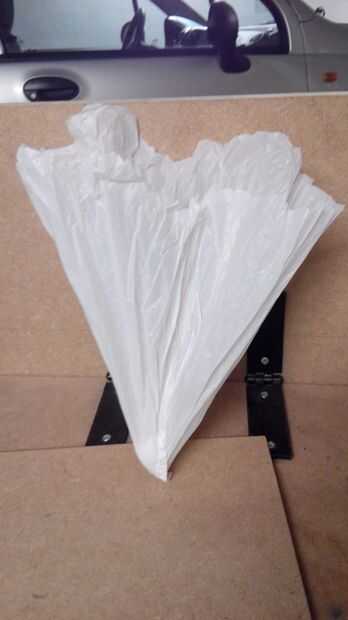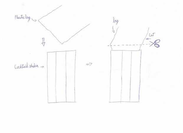 Primero doblar 'la hoja' alrededor de la placa base, la placa base debe estar en la parte doblada de 'la hoja'. Luego poner la bolsa de plástico en el shaker en corte (ver dibujo). La bolsa debe ser un poco superior a la coctelera.