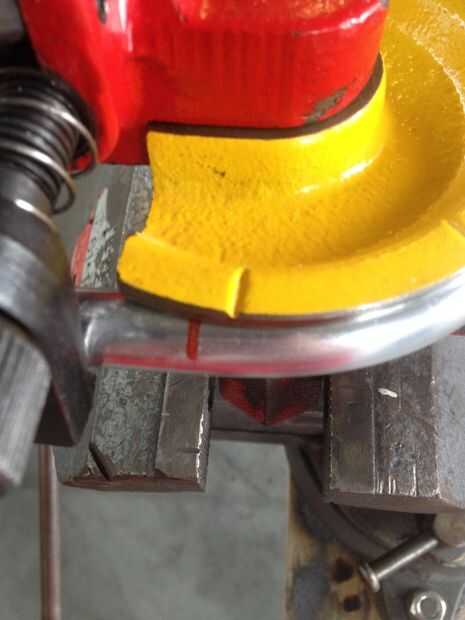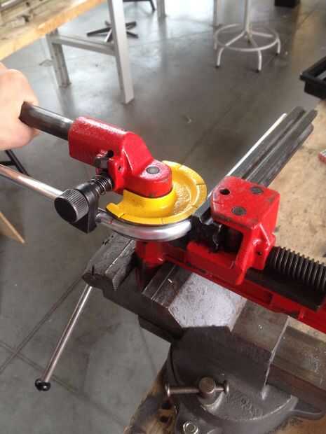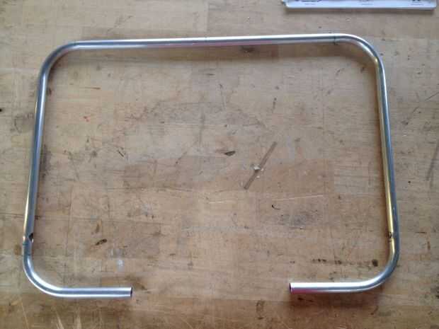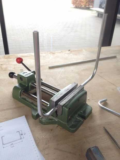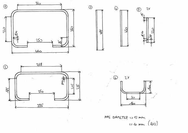 Copiar las marcas en el tubo y comenzar la flexión. VI cualquier sobrante de los extremos del tubo doblado. Luego perfore los agujeros de 10 mm para el eje de la pieza media. ¡ Sugerir a partir de un poco más pequeños que 10 mm y no perfore a través del marco! Una vez más, usted puede encontrar los cálculos para los agujeros en el dibujo.