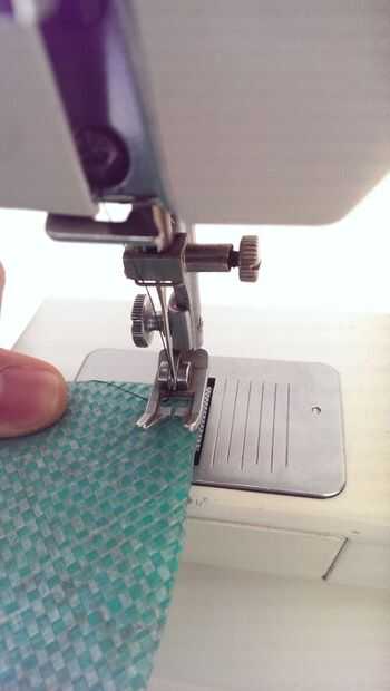 -Comienzan alineando el borde de la groundfoil con el egde del pie de la máquina de coser como se muestra en la imagen. Recuerde que debe ir hacia adelante y hacia atrás una vez aproximadamente un cm al iniciar o terminar una nueva costura. Esto hace que la costura no desentrañar.