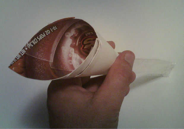 Primero enjuagar las bolsas y guardado en el congelador, hasta que estaba lista para rellenarlos. Ya que no tengo un embudo que pequeño, hice uno de la caja de los pops llegó. Sólo cortar un rectángulo de cartón, gire en un cono y cinta adhesiva. Entonces es fácil llenar las bolsas. Deje una pulgada o tan headspace. Utilicé una pinza para pin las tapas había cerrado, después con cuidado estaba parado les vertical en el congelador. Si eres muy muy cuidado, incluso no necesita para el cierre de tapas. Sólo de pie les por lo que puede congelar sin derramar.