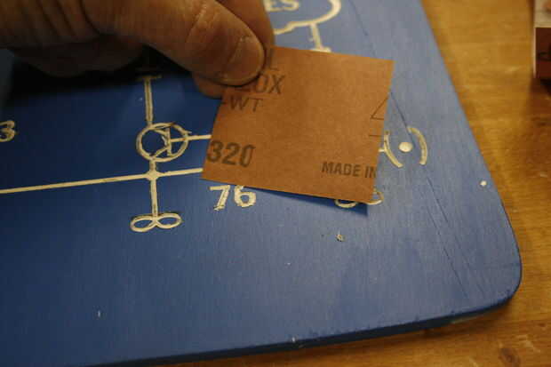 Hay un montón de lijado para hacer, primero con un grano 320 y luego un grano 400. Usted quiere conseguir la quemadura y pintura blanca, frotamiento abajo a la madera desnuda, si es necesario.
