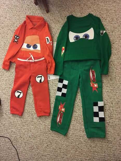 No haber añadido las caras en el traje y sabiendo que Halloween en Nueva Inglaterra puede ser frío decidí crear personaje sudaderas para los chicos al deporte bajo sus trajes. Encontrar los equipos de coordinación fue un gran reto pero fui capaz de encontrar lo que necesitaba de Walmart y Crazy 8. Para obtener las caras y las etiquetas carreras usé hierro de color oscuro en las transferencias y había planchada en. También se utiliza tela de fieltro para el patrón de tablero de ajedrez de ripslinger. Desde allí esbocé los ojos, números y nombres con pintura de tela.
