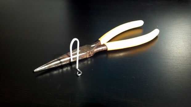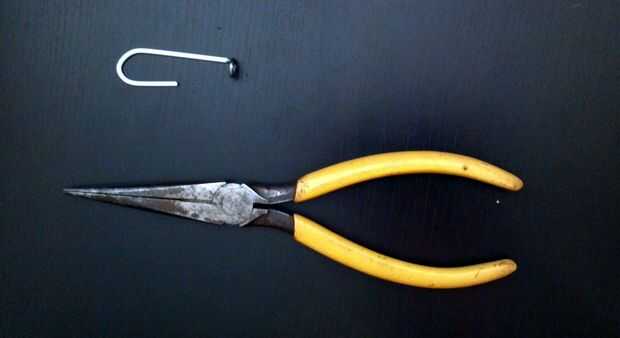 Corte corto segmento de percha y curva con los alicates para crear el gancho. Un pequeño círculo en el extremo opuesto del gancho de la curva.