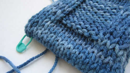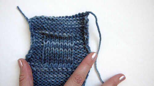 El cuerpo principal de la almohadilla es Bobo. Tejer la 1ª fila y entonces revés la 2ª fila. Repetir este proceso hasta que tengas 32 filas. Me gusta marcar la fila 24 con un marcador de contador de puntadas como será donde hacemos la parte inferior del doblez.