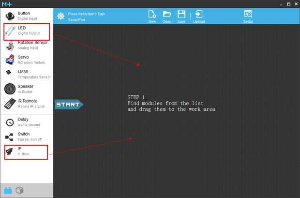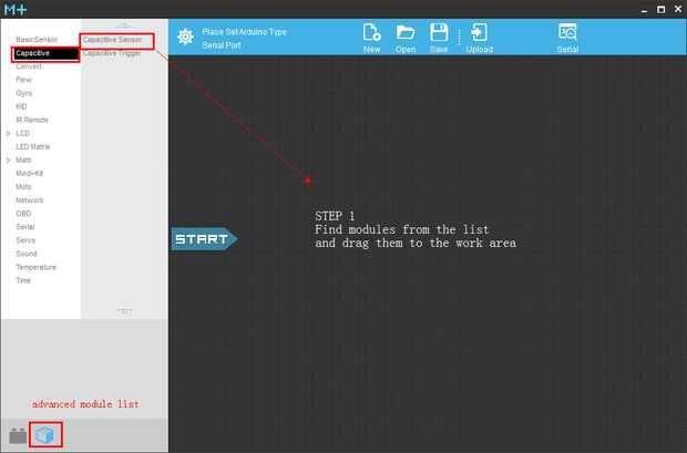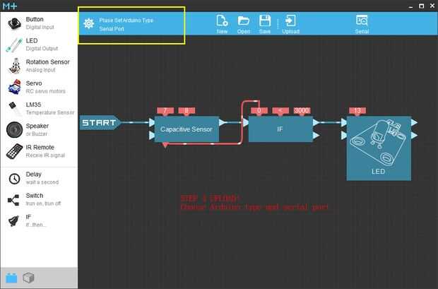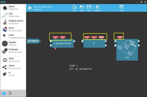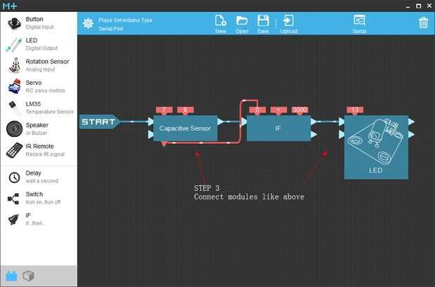 En lugar de escribir los códigos en el IDE, usted puede fácilmente hacer un programa con tan solo 3 módulos para este proyecto, capacidad de Sensor, si y LED.