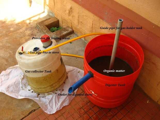 - La mezcla totalmente digerida sale a través de la tubería de salida. Esto puede ser recogido, diluido y utilizado como fertilizante para las plantas.